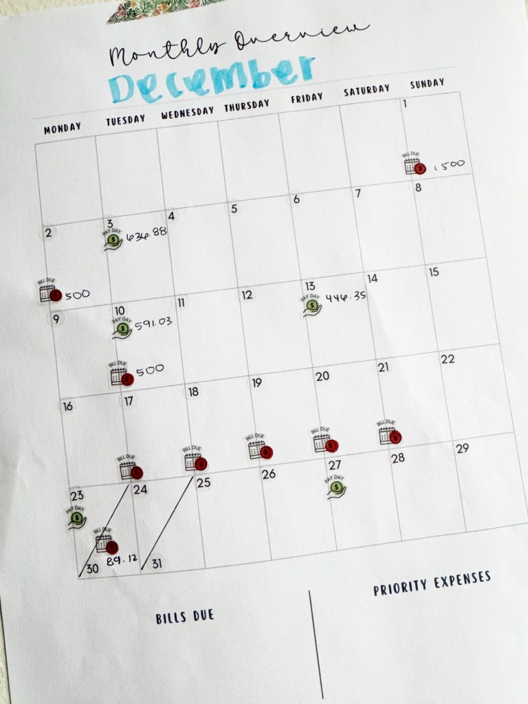 2. Mark Your Bills Due Dates: List out all your bills and their due dates for the month.